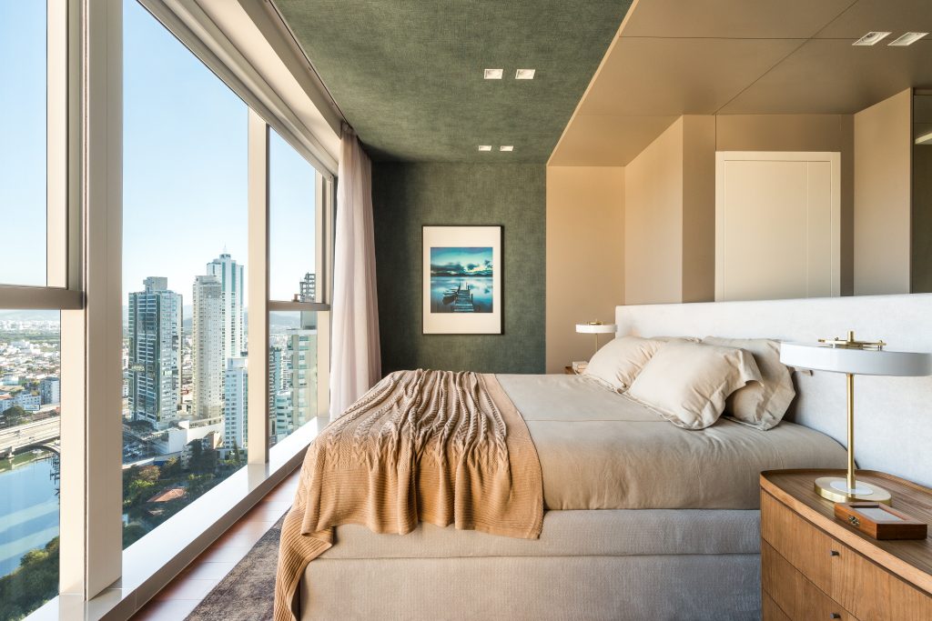 Um dos maiores desafios foi a escolha das cortinas, por conta da vista deslumbrante que o imóvel oferece