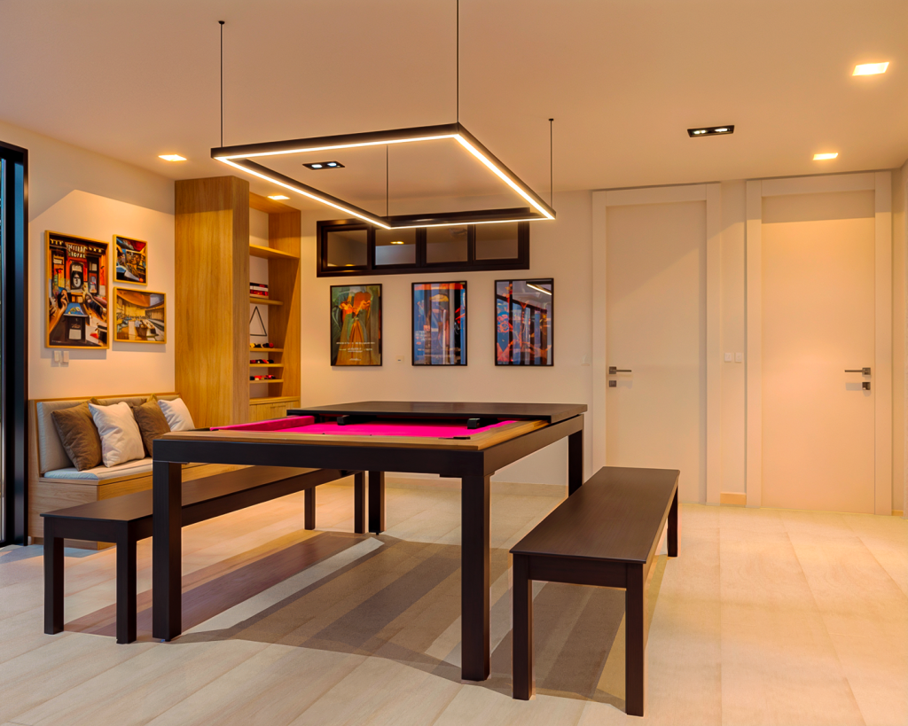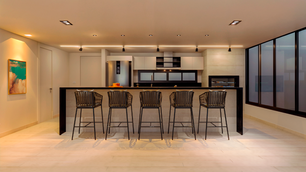 A nova área gourmet se integra à área de jogos, proporcionando um amplo espaço para encontros com amigos e momentos em família