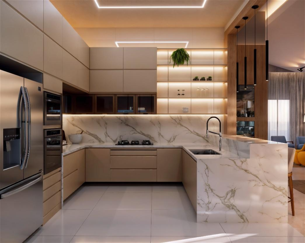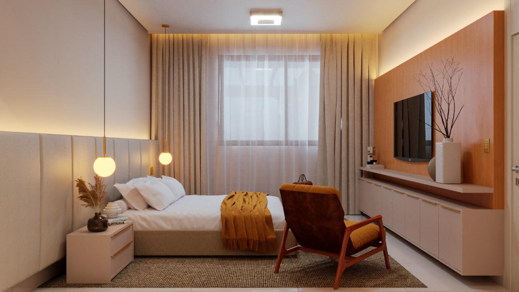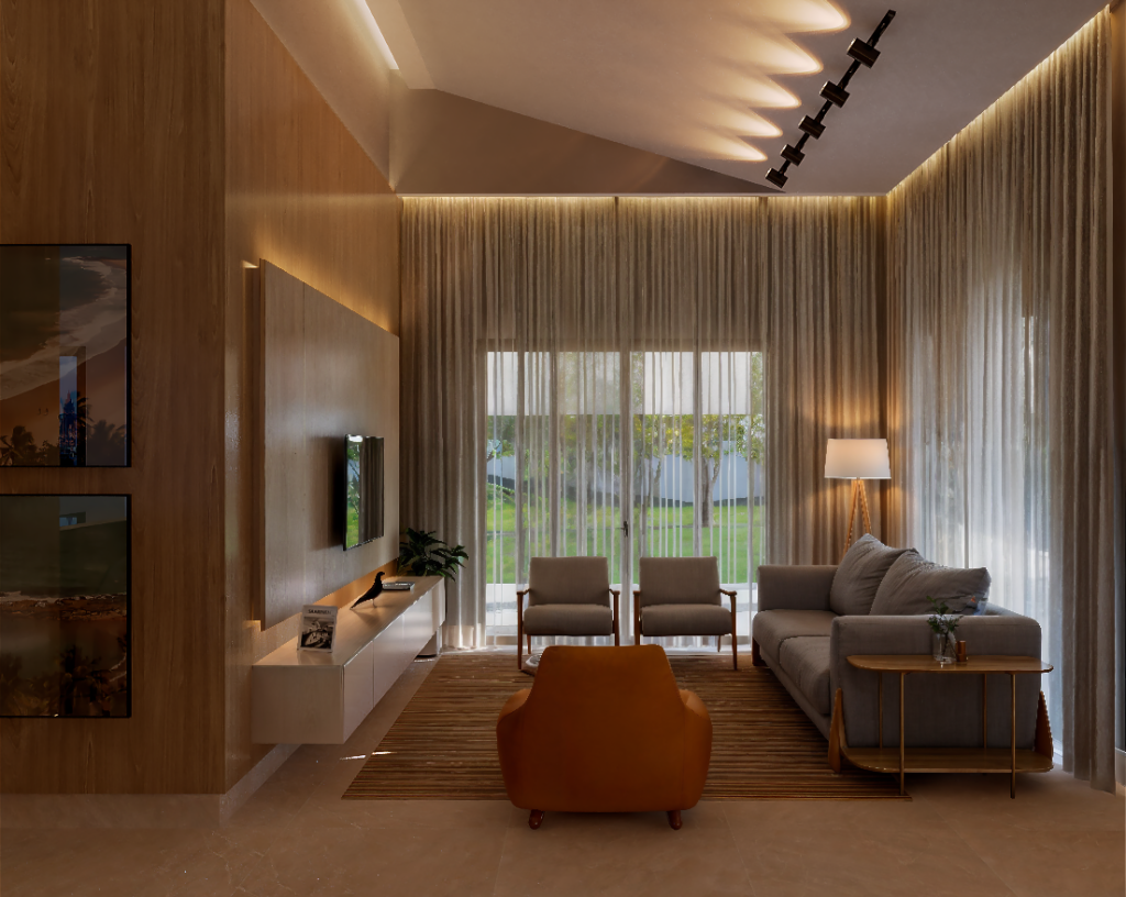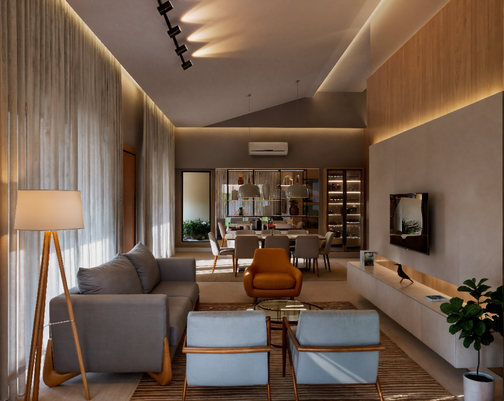 “É um projeto contemporâneo com forte influência minimalista e estética outonal, incorporando elementos naturais como tons amadeirados e iluminação quente”, comenta o arquiteto.