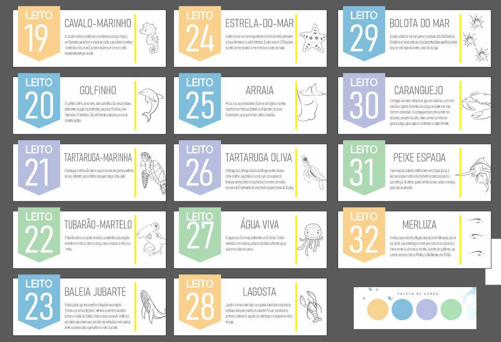 Detalhe das plaquinhas instaladas nas portas dos leitos, cada uma com o nome de um animal marinho
