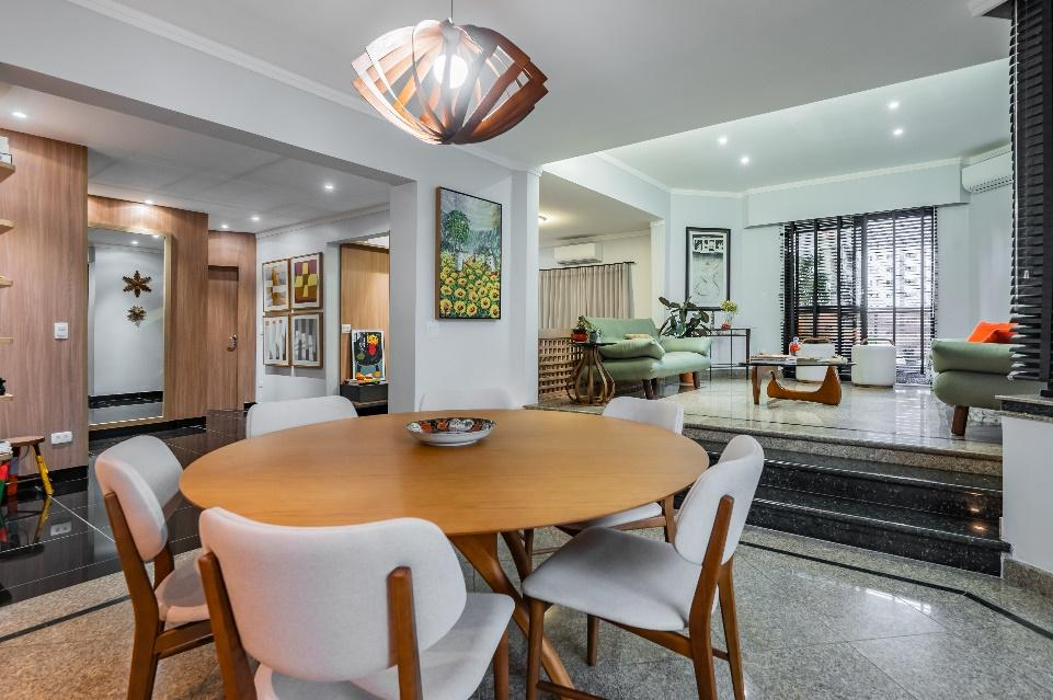 Em parceria com a designer de interiores Elizete Mazzini, a arquiteta propôs uma reformulação dos ambientes de estar e jantar, além da incorporação de um escritório que estava desativado, tudo sem mexer no piso existente. Dessa forma, sua intervenção se concentrou em uma área de 45 m².