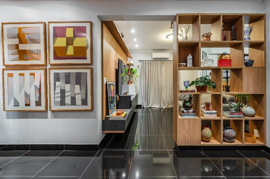 A estante de madeira, ao mesmo tempo que acomoda objetos, cria um novo layout para as salas