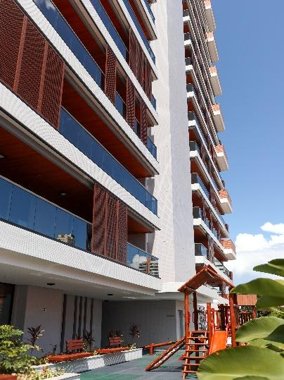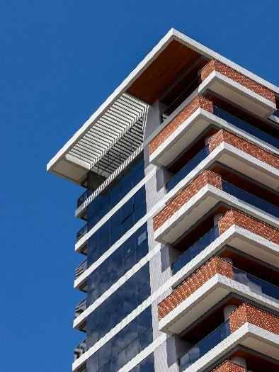 Detalhe do brise superior e varandas amplas, na fachada do edifício