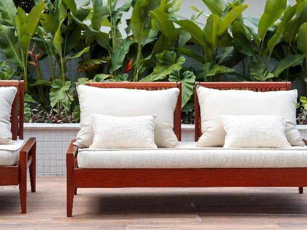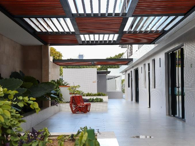 Detalhe de uma área comum, com muita vegetação e espaços com identidade e elegância
