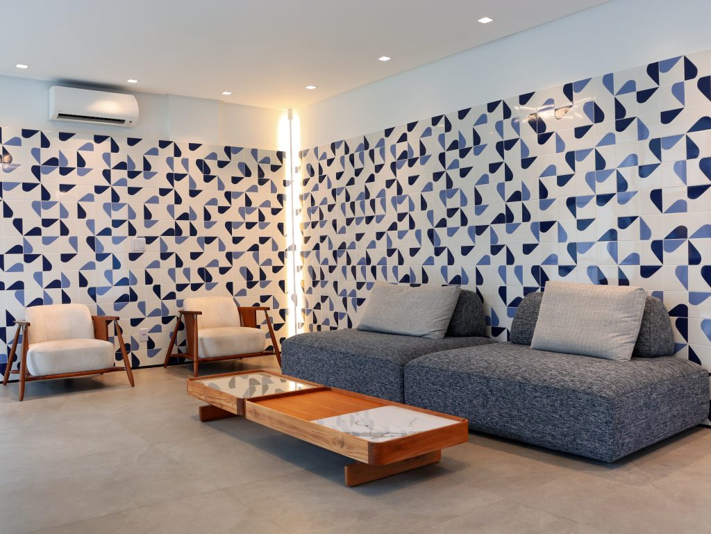 Uma das recepções do edifício, com mobiliário e painel cerâmico que se destacam pelo design