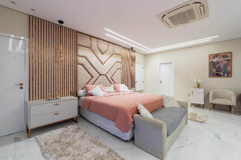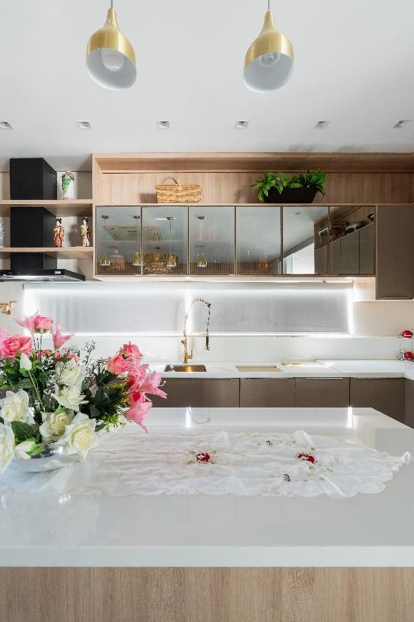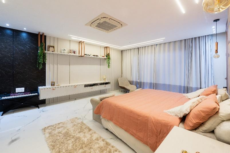 Assim, a sala de estar e cozinha, integradas, proporcionam aconchego, bem-estar e muita elegância. Na suíte master, o estilo moderno ganha elementos em dourado, cores suaves e sem exageros.