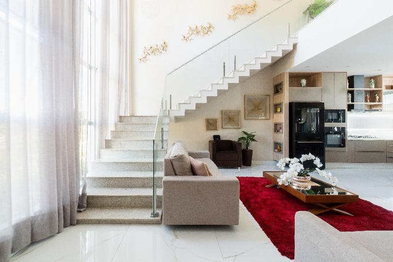 A sala de estar ganha amplitude com o pé-direito duplo e a imponente escada para a ala íntima