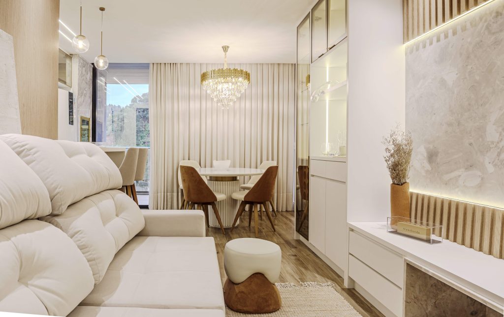 Localizado no edifício Spot One, anexo ao Shopping Balneário, o Projeto Y I G, assinado pela arquiteta Anna Woginski – Arquitetura e Interiores, transforma 85m² em um verdadeiro refúgio urbano. Entre tons claros, detalhes dourados e texturas amadeiradas, o projeto revela o olhar sensível e técnico da profissional, que uniu elegância, funcionalidade e conforto em cada ambiente.