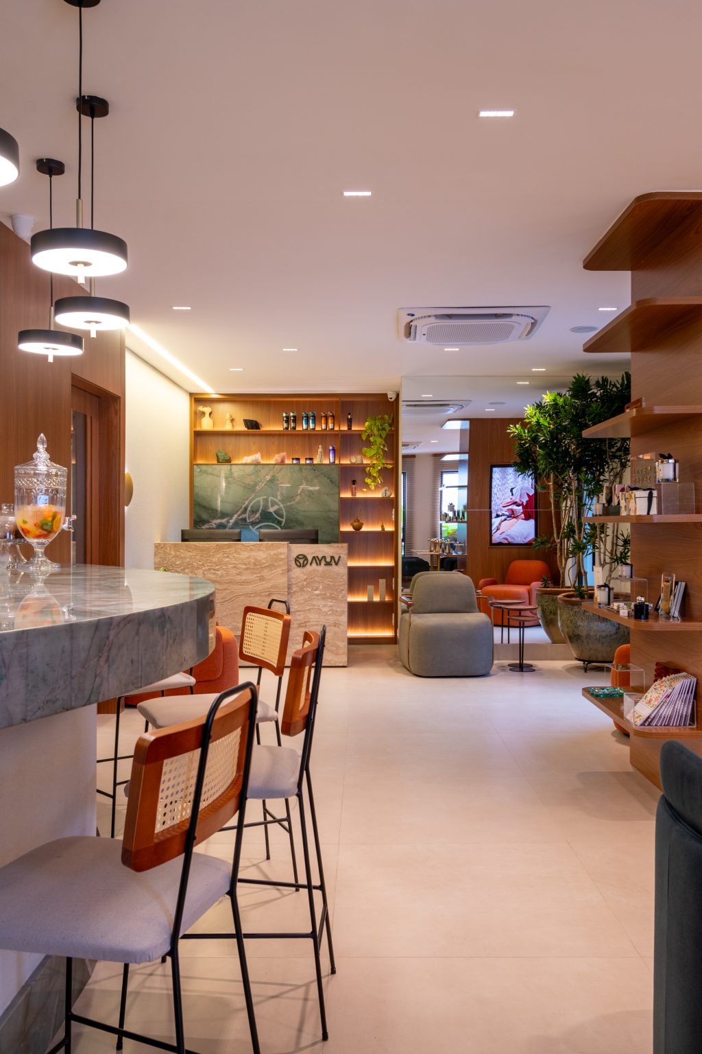 A recepção é um dos espaços de destaque, o primeiro contato dos clientes com o espaço, concebido para que a cliente se sinta à vontade para sentar na mesa ou banqueta e pedir um café ou drink no bar integrado ao ambiente – um local confortável, para aguardar o atendimento e fazer uma pausa reconfortante.