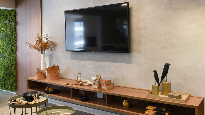 Por fim, o verde entrou por meio de uma parede com jardim artificial, solução que traz frescor ao conjunto e suaviza o visual urbano, aproximando o apartamento de uma sensação de bem-estar, algo importante para um lar moderno, integrado e sempre pronto para acolher.