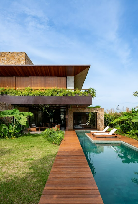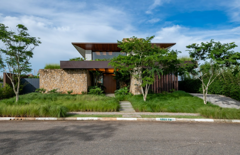 O paisagismo, também assinado pelo Jardim Bossa, é parte essencial do projeto, quase uma extensão da arquitetura. Ele reforça a integração com o entorno e consolida a proposta de uma residência onde natureza, arquitetura e bem-estar coexistem em perfeita sintonia.