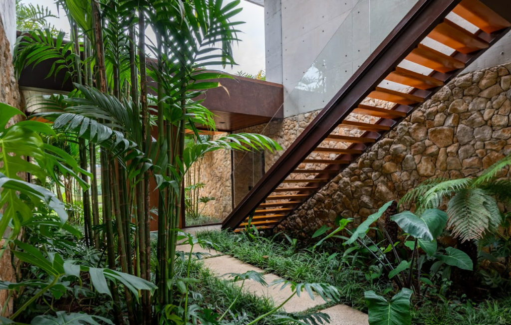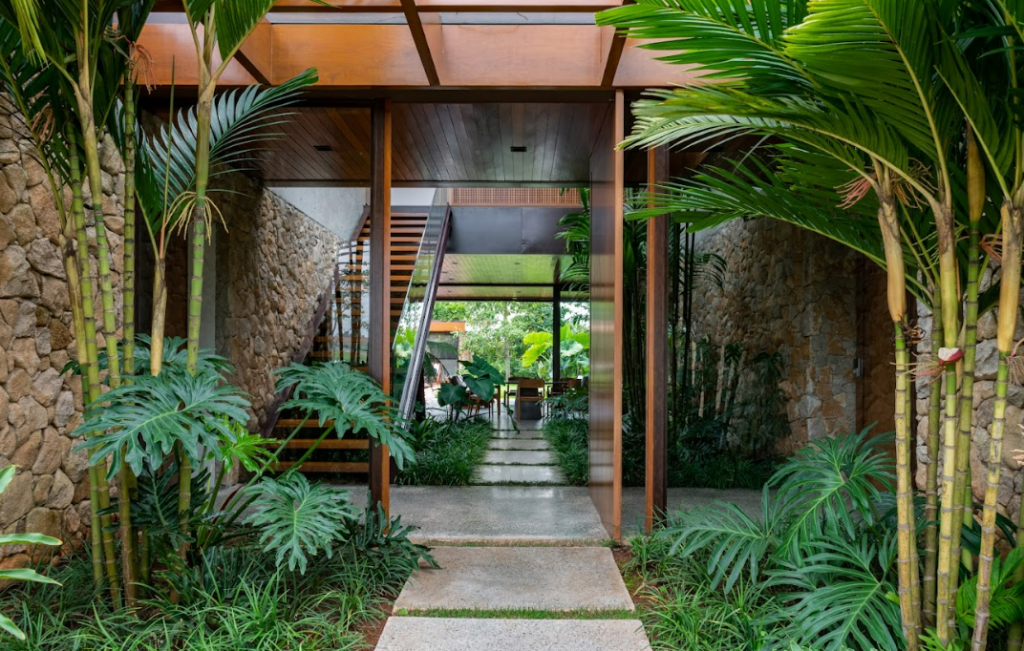 A arquitetura se desenvolve a partir dessa premissa, incorporando jardins, varandas generosas e áreas livres de quintal que convidam ao caminhar, à contemplação e ao uso cotidiano dos espaços externos. A vegetação assume papel protagonista, criando uma relação quase simbiótica entre a edificação e a paisagem.