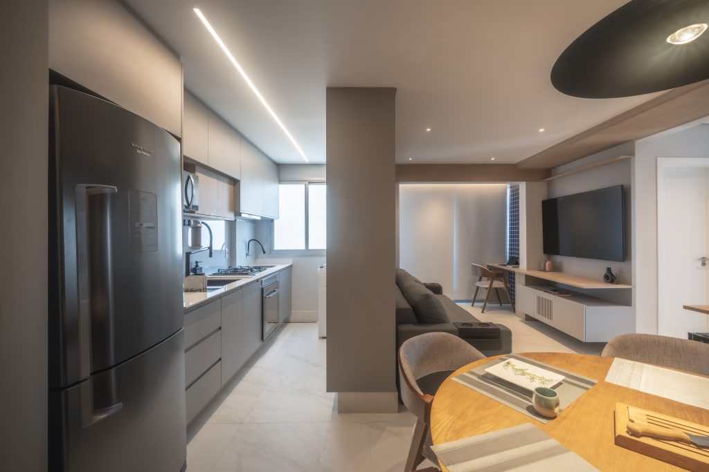 A integração da sala e cozinha foi uma solução estratégica para ampliar os ambientes