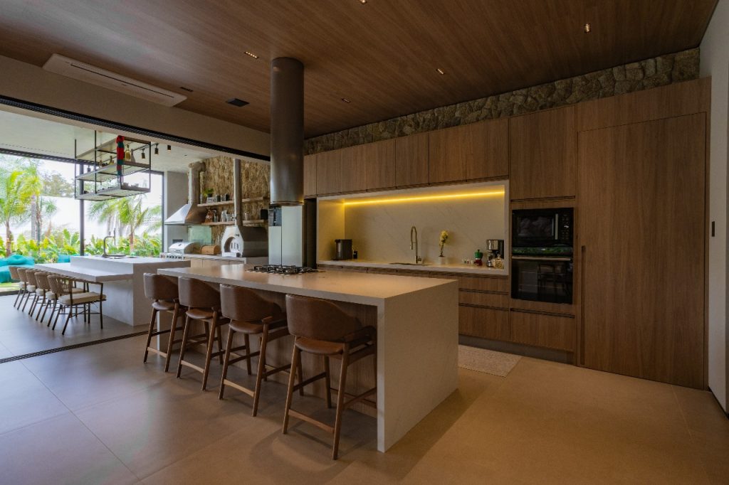 Para atender a essas demandas, a arquitetura aposta em ambientes amplos, integrados e visualmente abertos, com forte presença de materiais naturais, como madeira, pedra e vegetação. Esses elementos conferem leveza aos espaços, reforçam a sensação de aconchego e criam uma conexão direta com a natureza, característica marcante do projeto.